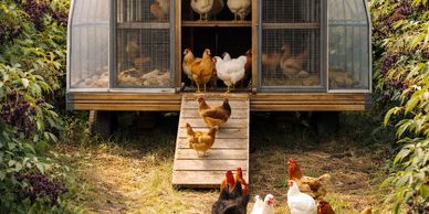 Pastured laying hens housed in mobile prairie schooner-style housing, producing eggs for farm-gate sales only.